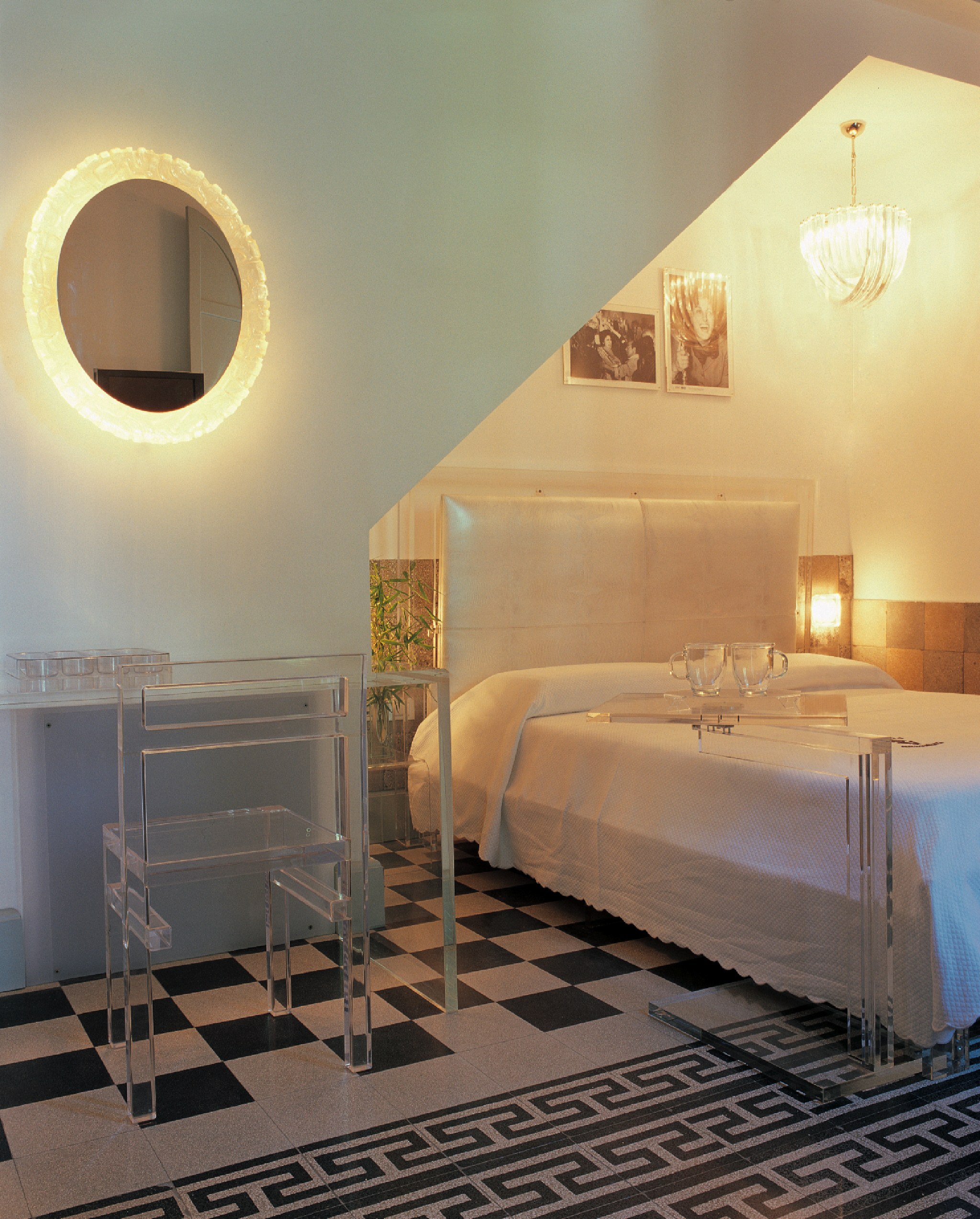 Trasparenza e lucentezza caratterizzano la Crystal room. Un letto in plexiglass – con testiera in pelle stampata “lucertolina” argento su disegno di Anna Fendi Venturini – e un armadio trasparente conferiscono alla stanza una magica atmosfera di leggerezza e glamour. Le poltrone sono datate anni ’50 così come lo specchio di Fontana Arte. Le foto alle pareti ritraggono la mitica Anna Magnani sul set di “Roma Città Aperta”. Il pavimento, patchwork a quadri e greche, è realizzato con mattonelle in graniglia d’epoca.