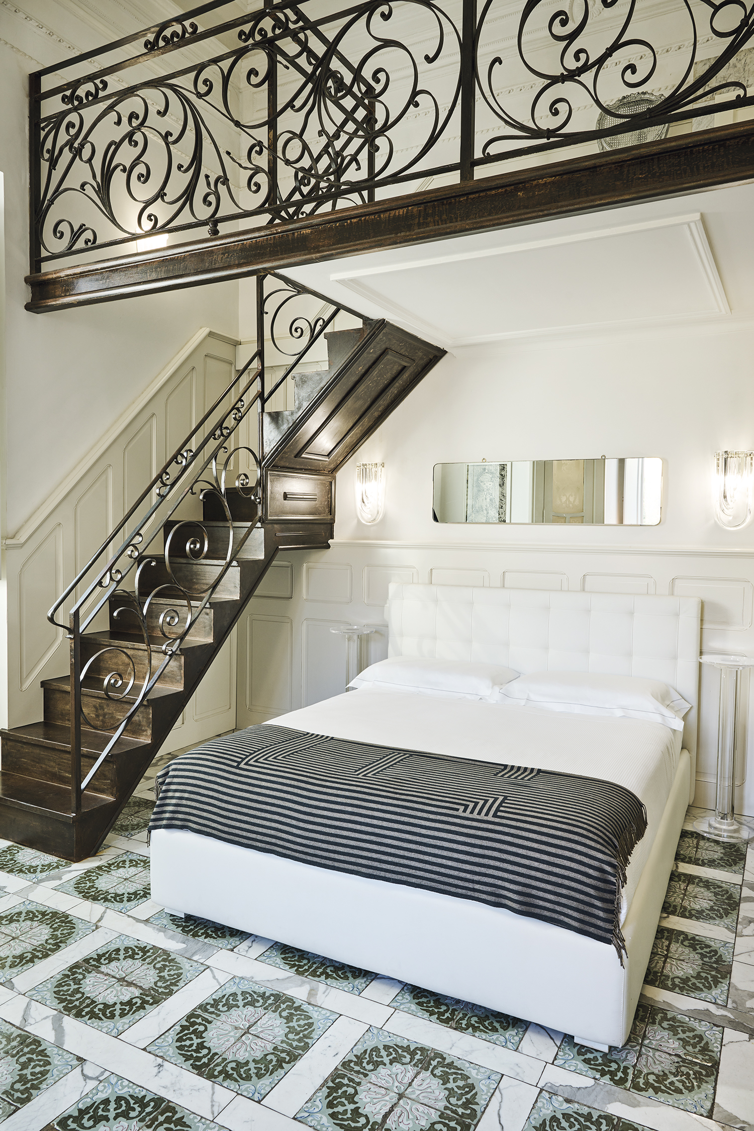 L’ingresso si apre su uno spazio luminoso, caratterizzato da alti soffitti e boiserie bianche che donano eleganza e armonia. Il pavimento in marmo, impreziosito da motivi geometrici verde e bianco, accompagna l’ospite verso un letto matrimoniale imbottito in pelle bianca e incorniciato da una parete con pannellatura classica e illuminazione a applique in cristallo. Un’elegante scala con ringhiera in ferro battuto conduce al soppalco, dove è collocata una piccola cucina in marmo, completa per il tè e il caffè.
