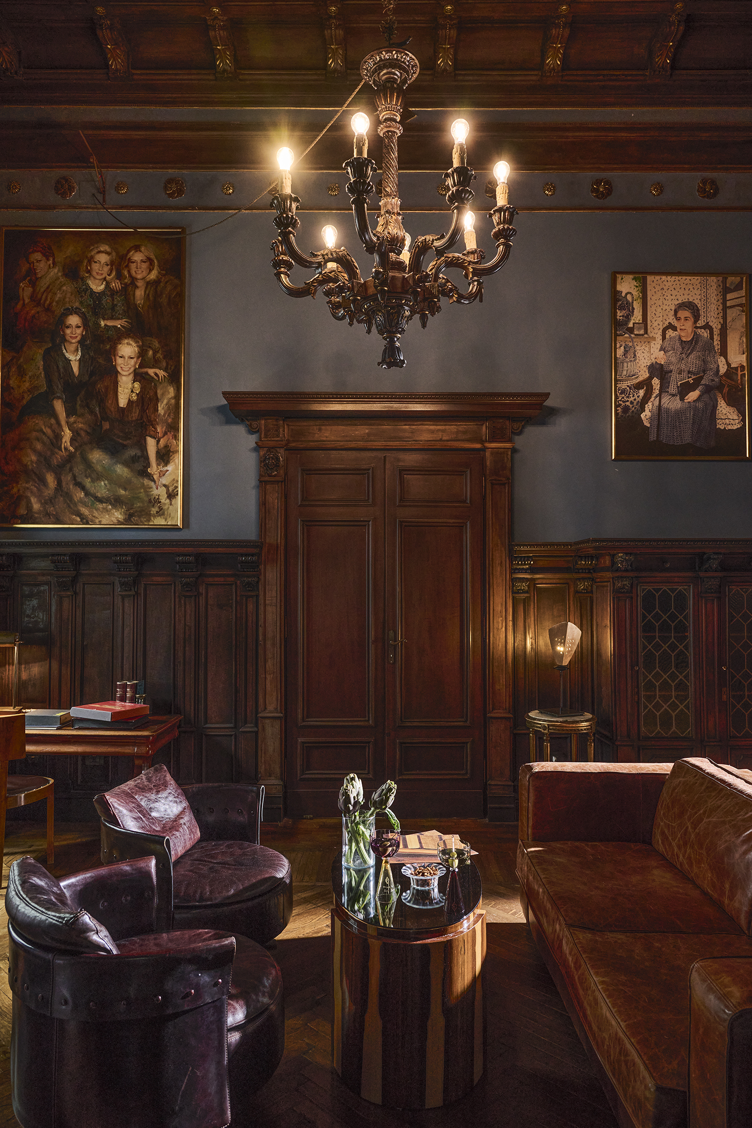 Fa da anticamera con tono storico e solenne lo Studio Umbertino dove il legno scuro domina le pareti rivestite con boiserie intagliate e librerie chiuse da sportelli con vetri piombati, che custodivano probabilmente registri e volumi giuridici. Il soffitto è un capolavoro: cassettonato in legno con dettagli dorati, che riflettono la luce del grande lampadario centrale in stile ottocentesco, conferendo alla stanza un senso di autorità e ricchezza. Le pareti sono dipinte in un elegante blu polvere color pavone, che crea contrasto con il legno scuro e mette in risalto i ritratti famiglia, tra cui si raffigurano le cinque sorelle e la capostipite Adele Fendi e la padrona di casa Anna Fendi. Ogni elemento parla di ordine e autorevolezza: la disposizione simmetrica delle librerie, la presenza di sedute comode ma non ostentate.