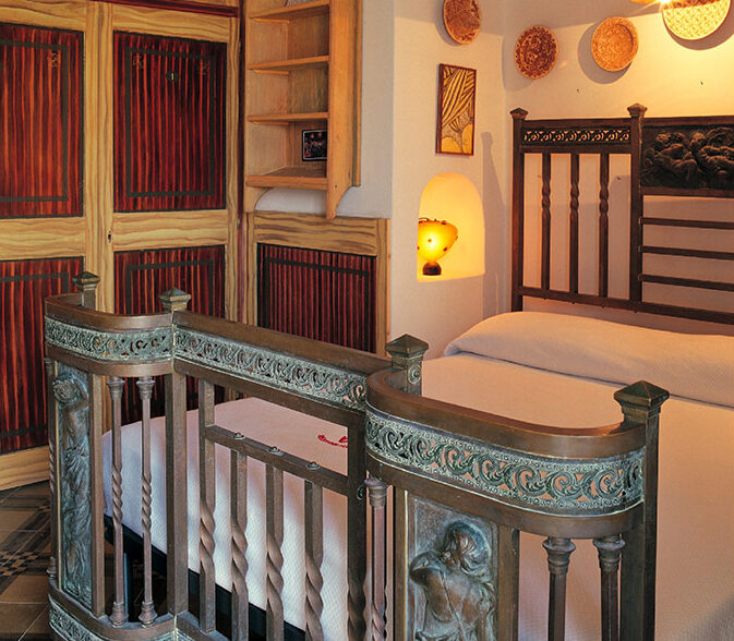 La stanza è interamente rivestita da un’ampia armadiatura dipinta faux bois. Un grande letto in bronzo e ottone, originale ponzese, da il tono all’ intero arredo. Assieme a un pavimento novecentesco realizzato in cemento colorato e in toni speziati.