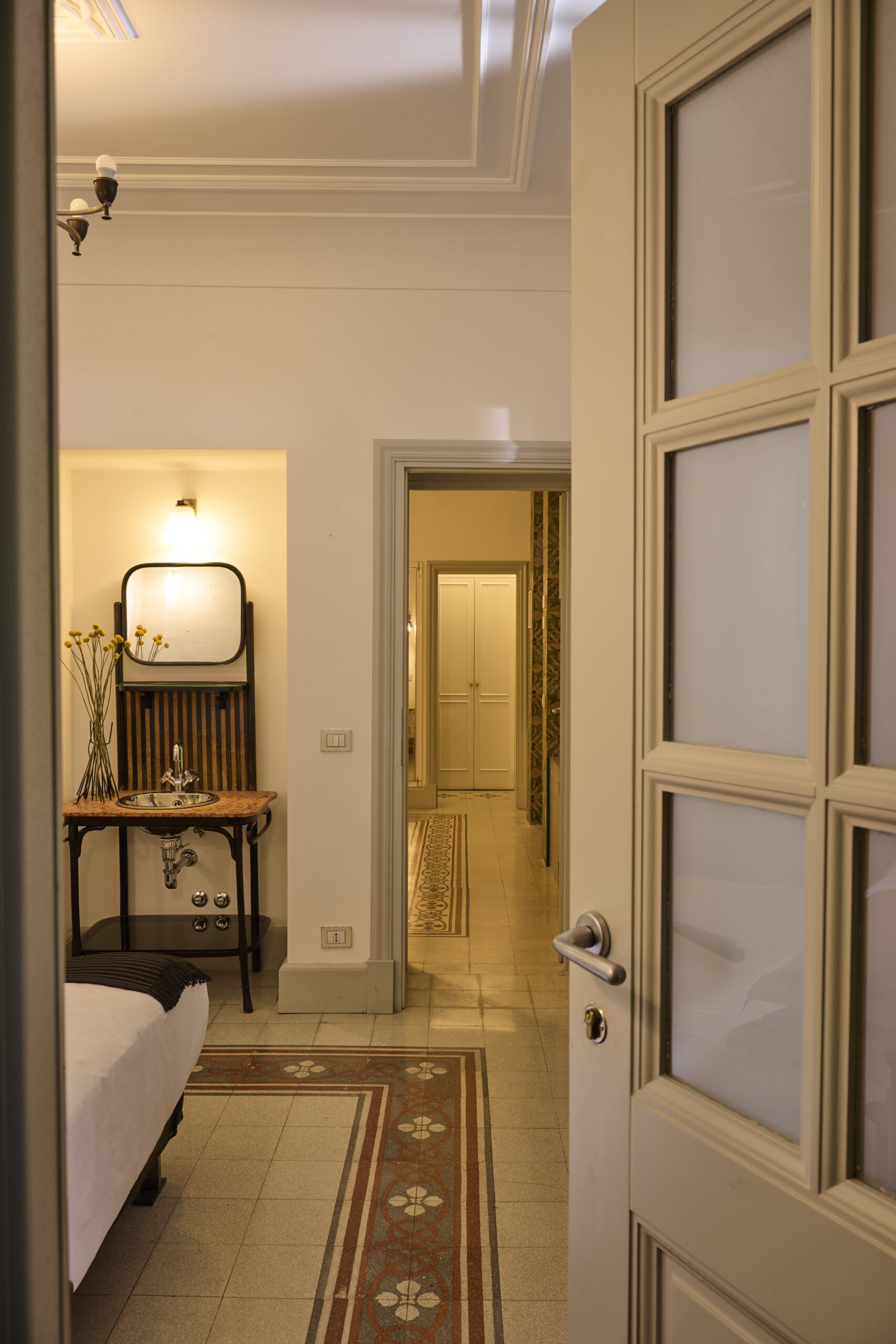 Una classica boiserie a righe tabacco e nero, il letto, i comodini e l’armadio – originali dell’epoca – rievocano come meglio non si potrebbe il grande Architetto nella Hoffmann room a lui dedicata. A quel certo gusto sono infatti intonati anche i lumi Fendi; e un romantico, delizioso disegno di Elisabeth Chaplin. Le sedie sono Thonet.